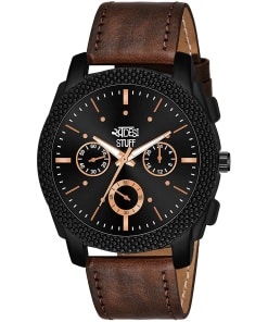 Stylish Analog Men’s Watch with Black Dial and Brown Leather Strap