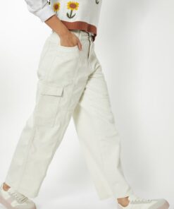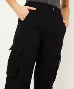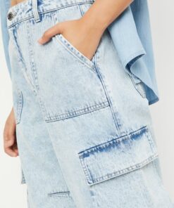 Mid Rise Women Solid Wide Leg High Rise Cargo Jeans with Contemporary Modern Fit