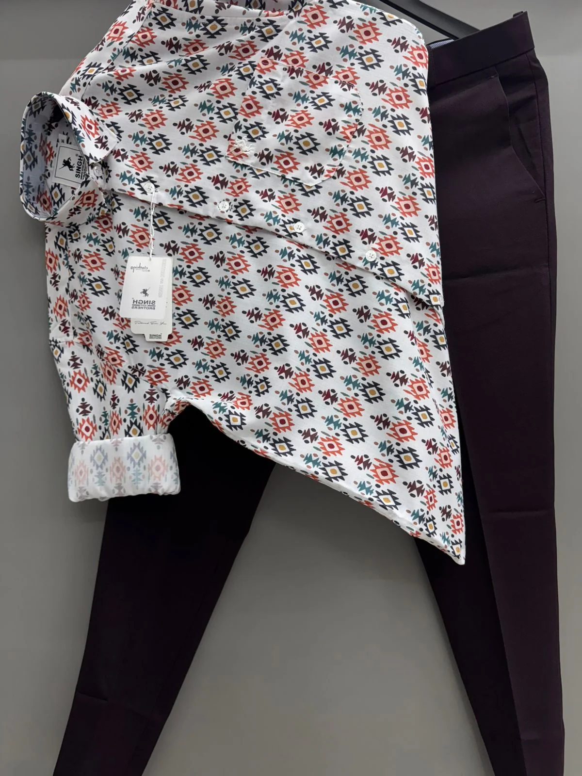 This set is highly versatile and easy to style. The patterned white shirt can be paired with neutral-colored pants or chinos for a more toned-down look, while the maroon pant can be teamed with solid or lightly patterned shirts for a variety of stylish combinations. Accessories such as a leather belt, formal shoes, or even casual loafers can elevate the overall outfit, allowing the wearer to adapt it for different occasions effortlessly.