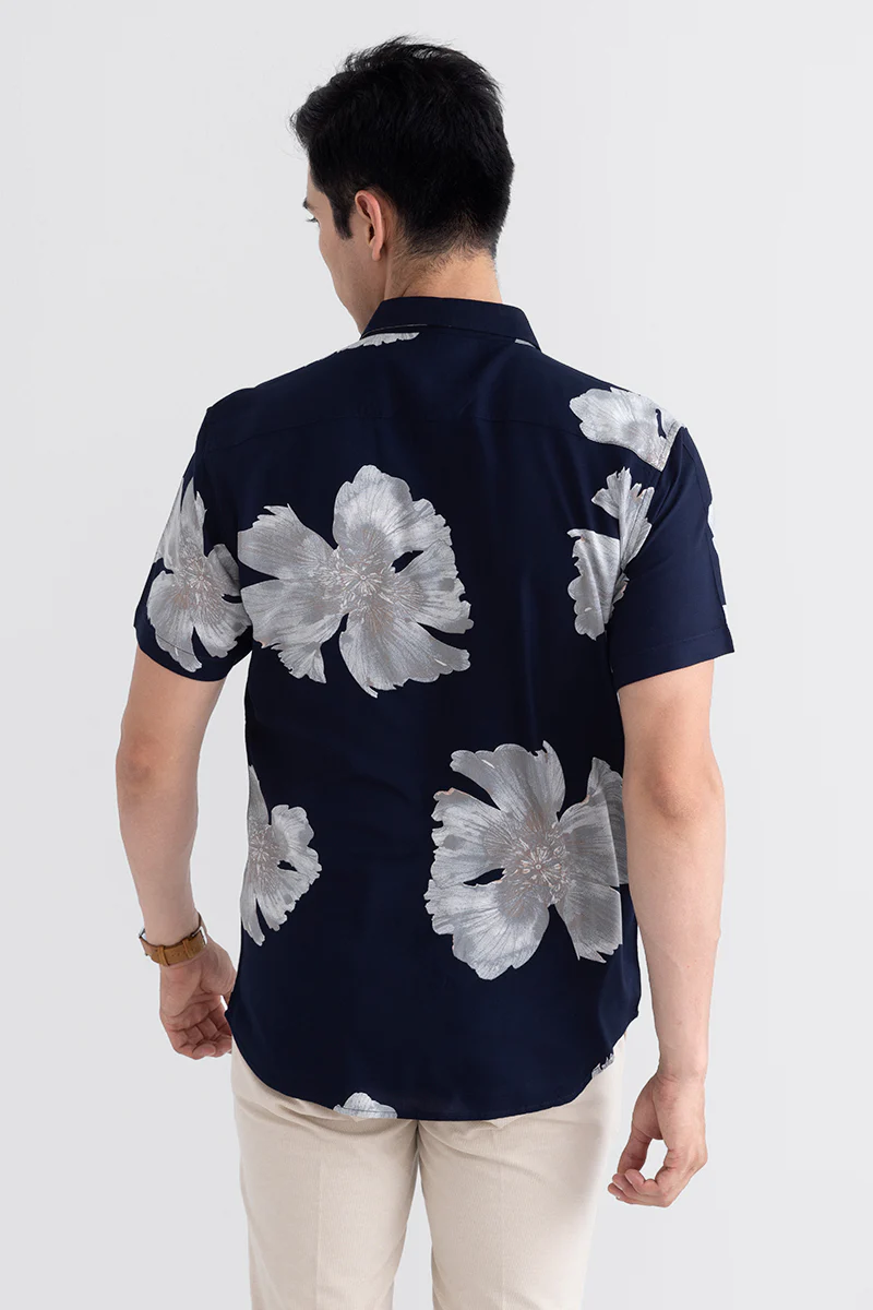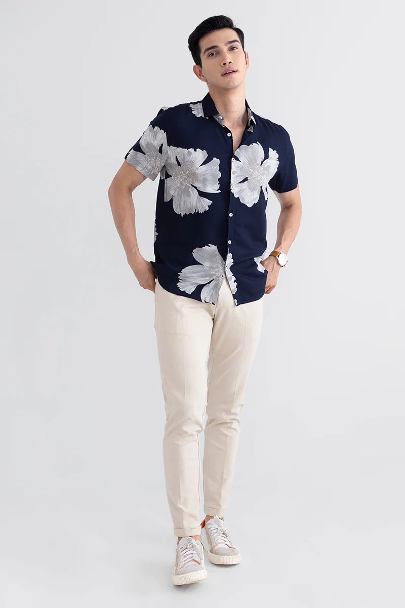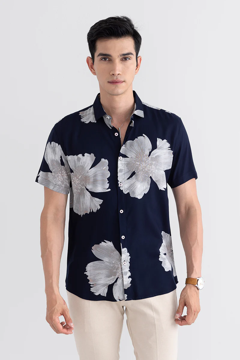 Pair it with tailored trousers and a blazer for a polished office look, or dress it down with jeans for a more casual yet equally stylish ensemble. Versatile and eye-catching, the Exo Leaf Navy Shirt effortlessly transitions from day to night, making it suitable for any occasion.