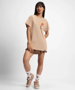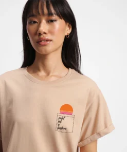 The warm ginger root brown color brings an earthy, versatile tone to your wardrobe, making it easy to pair with a variety of bottoms and layers. The standout shine graphic print adds a modern, eye-catching touch, while the functional pocket detail enhances both style and practicality. Designed in a relaxed boyfriend fit, this T-shirt provides a loose, comfortable silhouette that is perfect for a laid-back, trendy look.