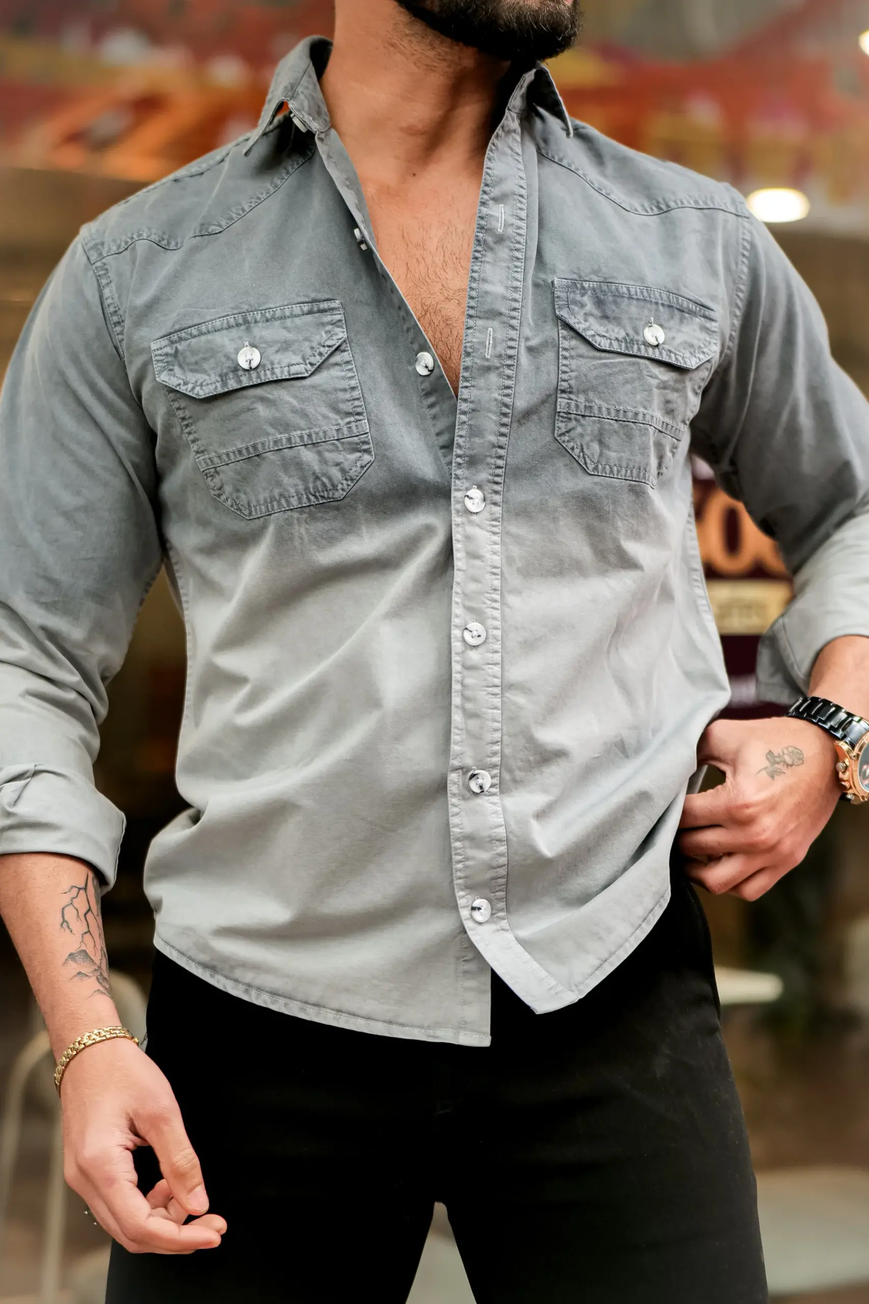 • Unique shirt featuring a double shade in grey and off-white.