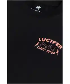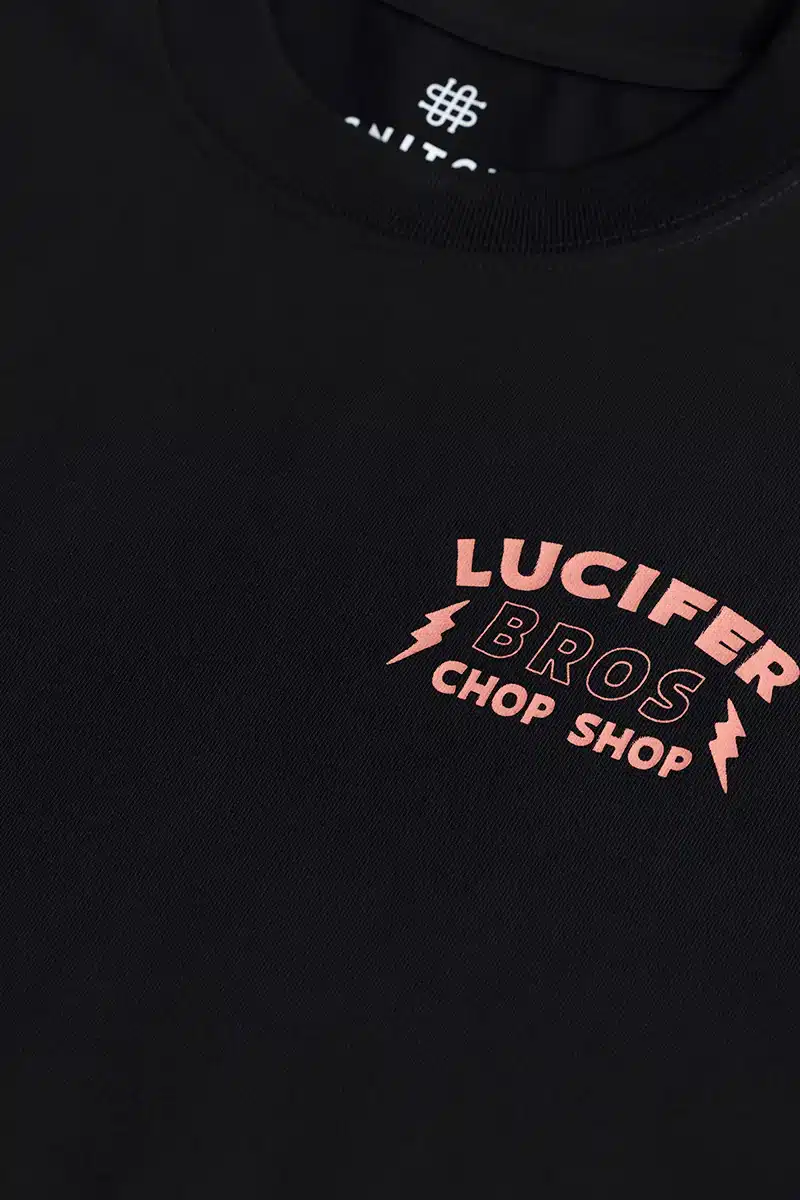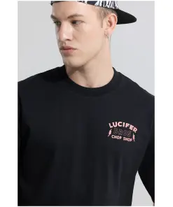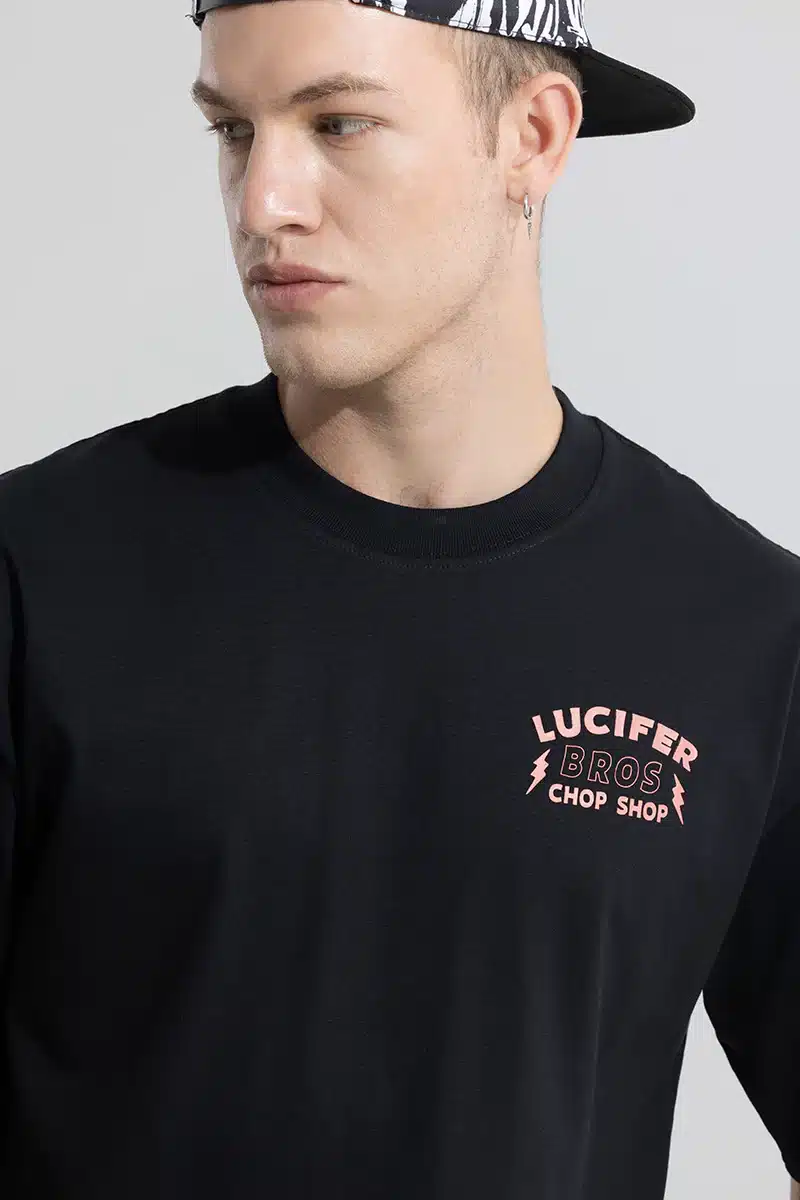 Lucifer Bros Black Oversized T-shirt, a garment that blends dark sophistication with urban edge. Crafted with meticulous detail, this tee is not just clothing—it’s a statement of rebellion and mystique.