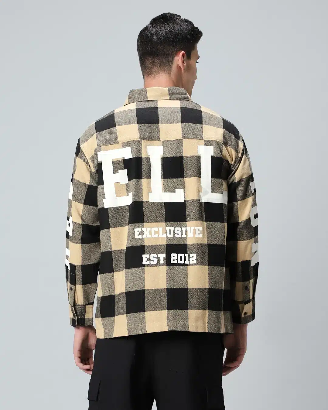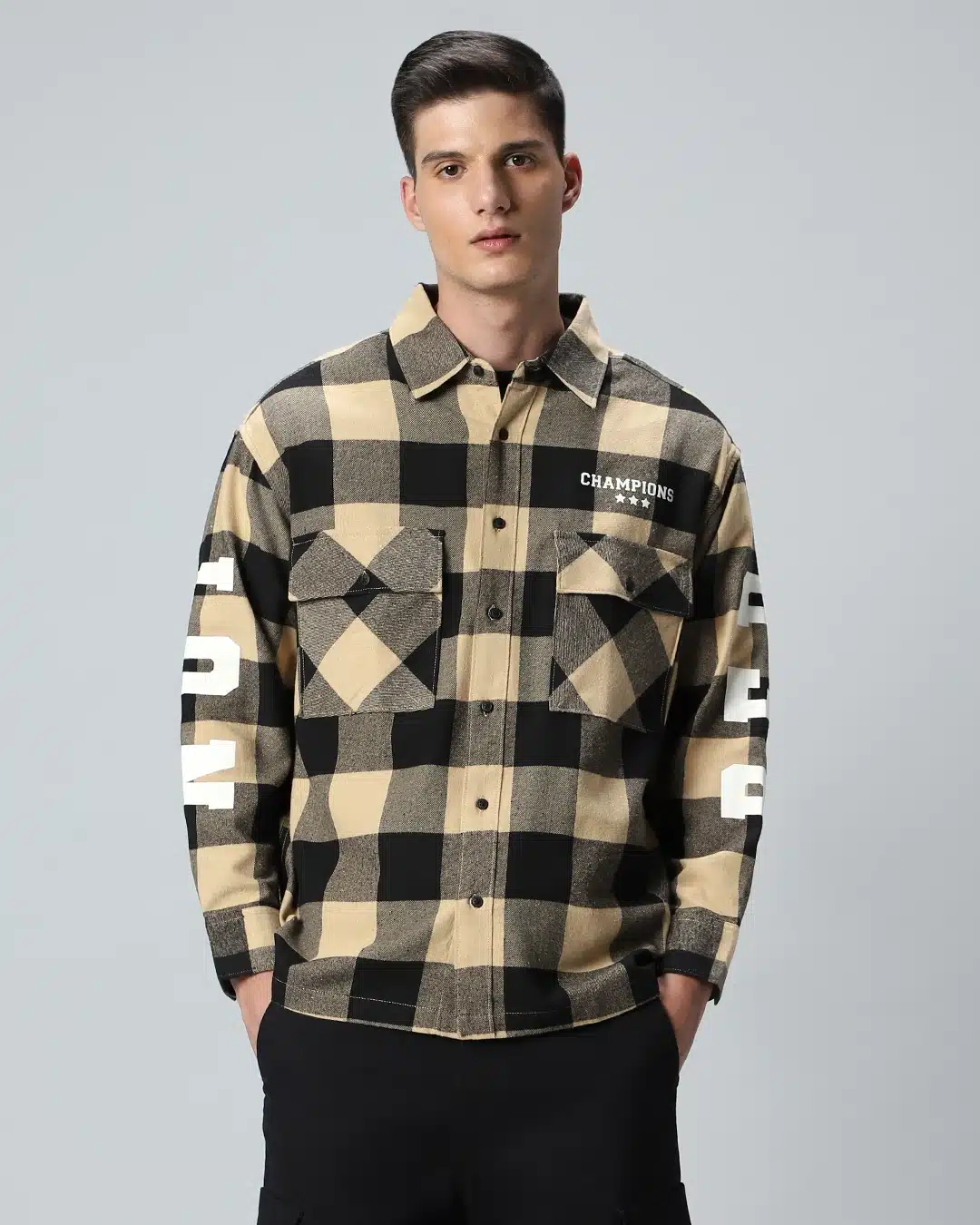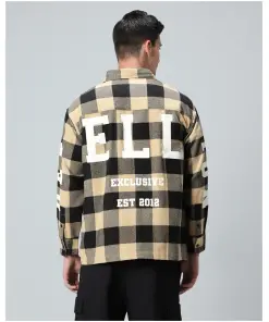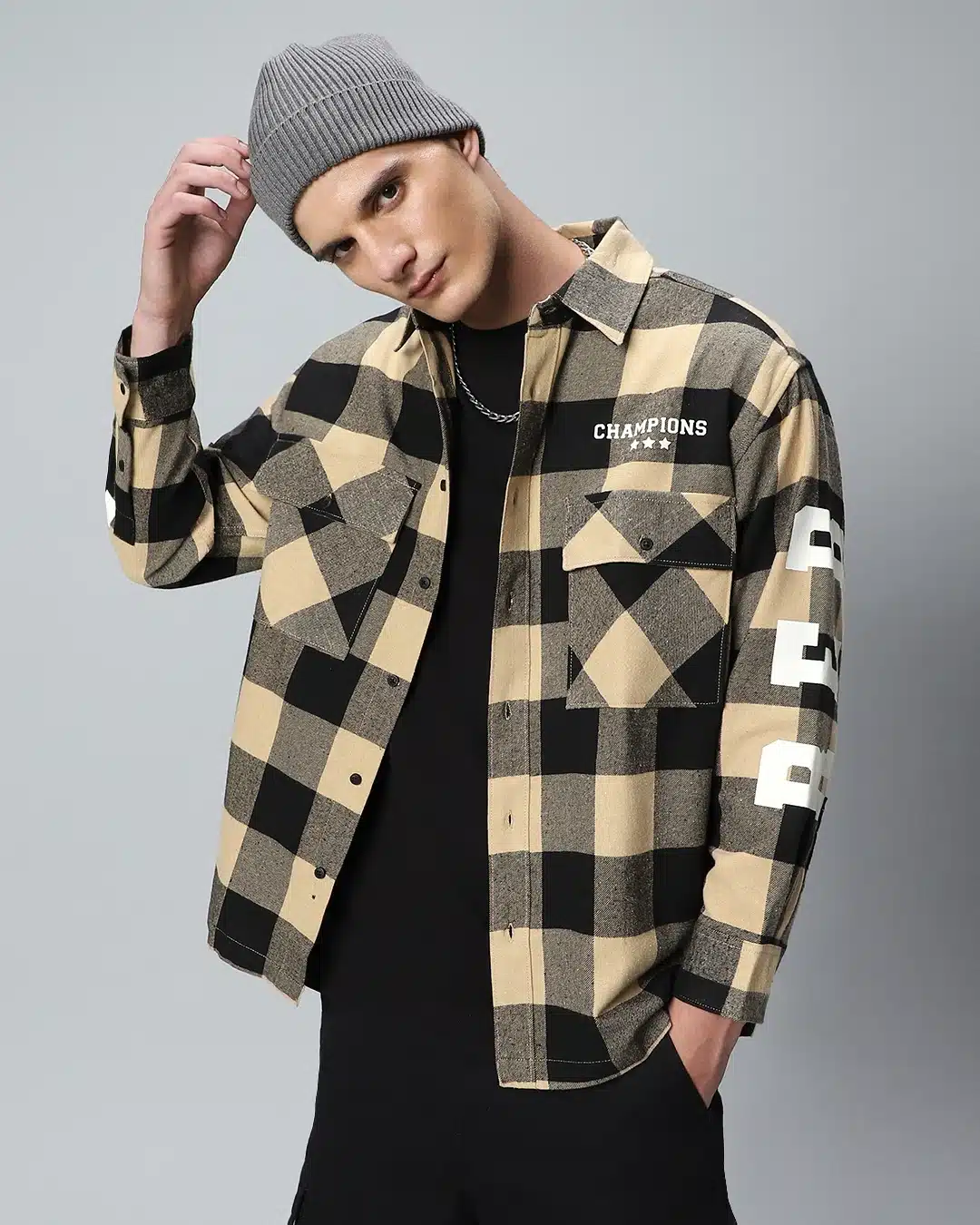 Men’s Brown & Black Reb Checked Oversized Shirt. This statement piece redefines casual sophistication with its striking blend of rich brown and sleek black hues, accented by a distinctive check pattern.