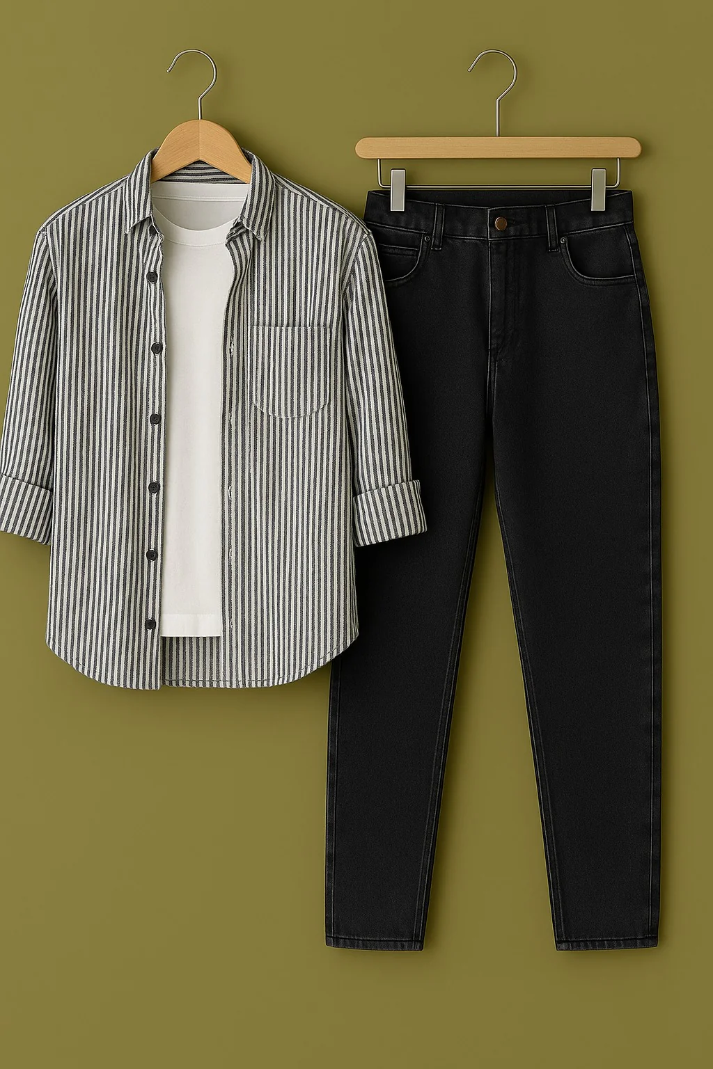 Comfort is a key feature of this outfit. The breathable cotton shirt and flexible denim pants ensure all-day wearability, while the relaxed fit allows freedom of movement without compromising style.