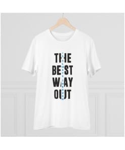 ‘The Best Way Out’ Printed White PC Cotton T-Shirt – a statement piece in men’s fashion that seamlessly combines comfort with a dose of inspiration. Elevate your casual style with this unique and trendy T-shirt designed to make a bold statement.