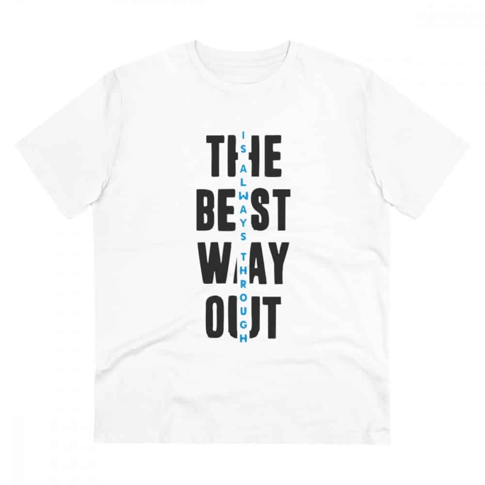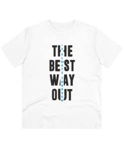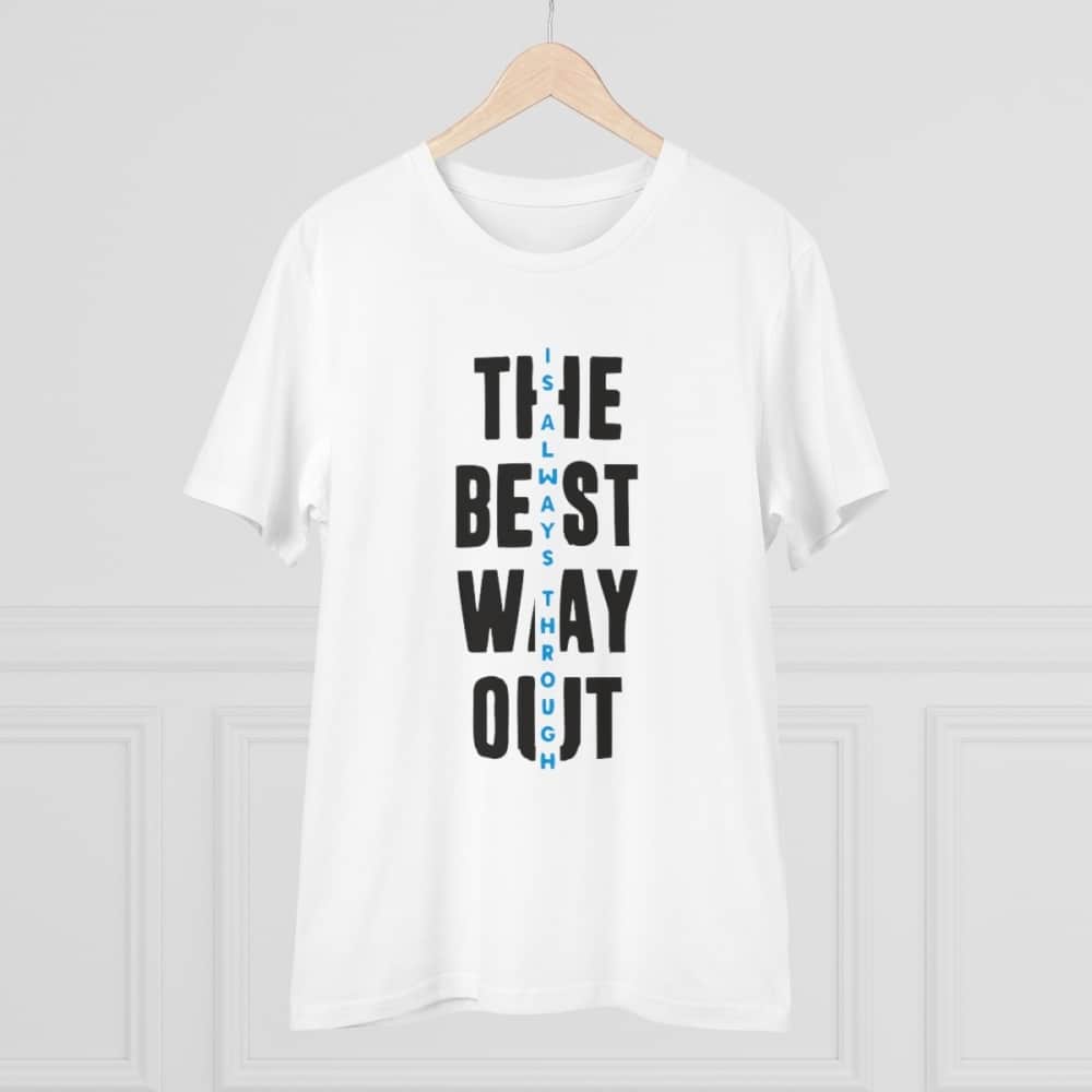 Crafted from premium PC cotton, this T-shirt ensures a soft and breathable feel against your skin, providing comfort throughout the day. The classic white hue serves as a versatile backdrop for the powerful and motivational “The Best Way Out” print, adding a touch of positivity to your ensemble.