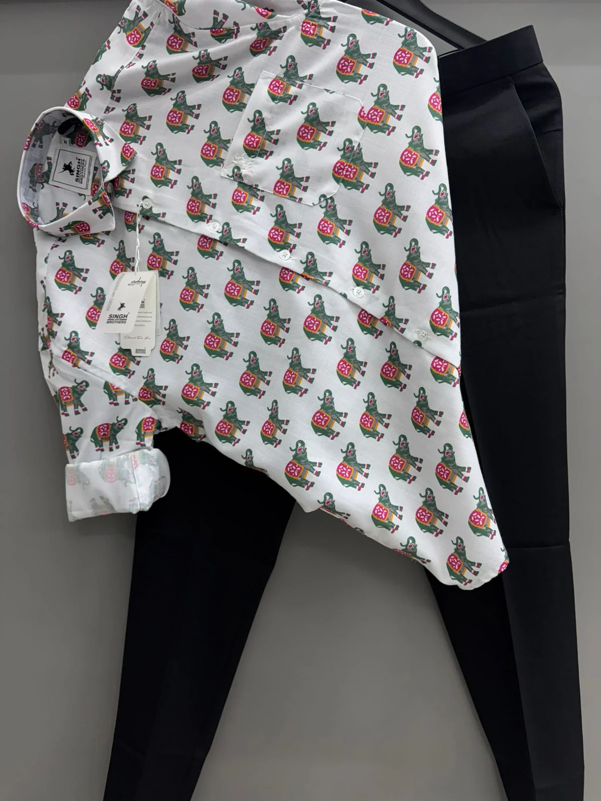 The matching pants are designed to complement the printed shirt perfectly, creating a coordinated and polished appearance. Made from premium fabric, they offer a comfortable fit while maintaining a sharp and refined silhouette. The balanced design ensures the set looks cohesive without feeling overdone.