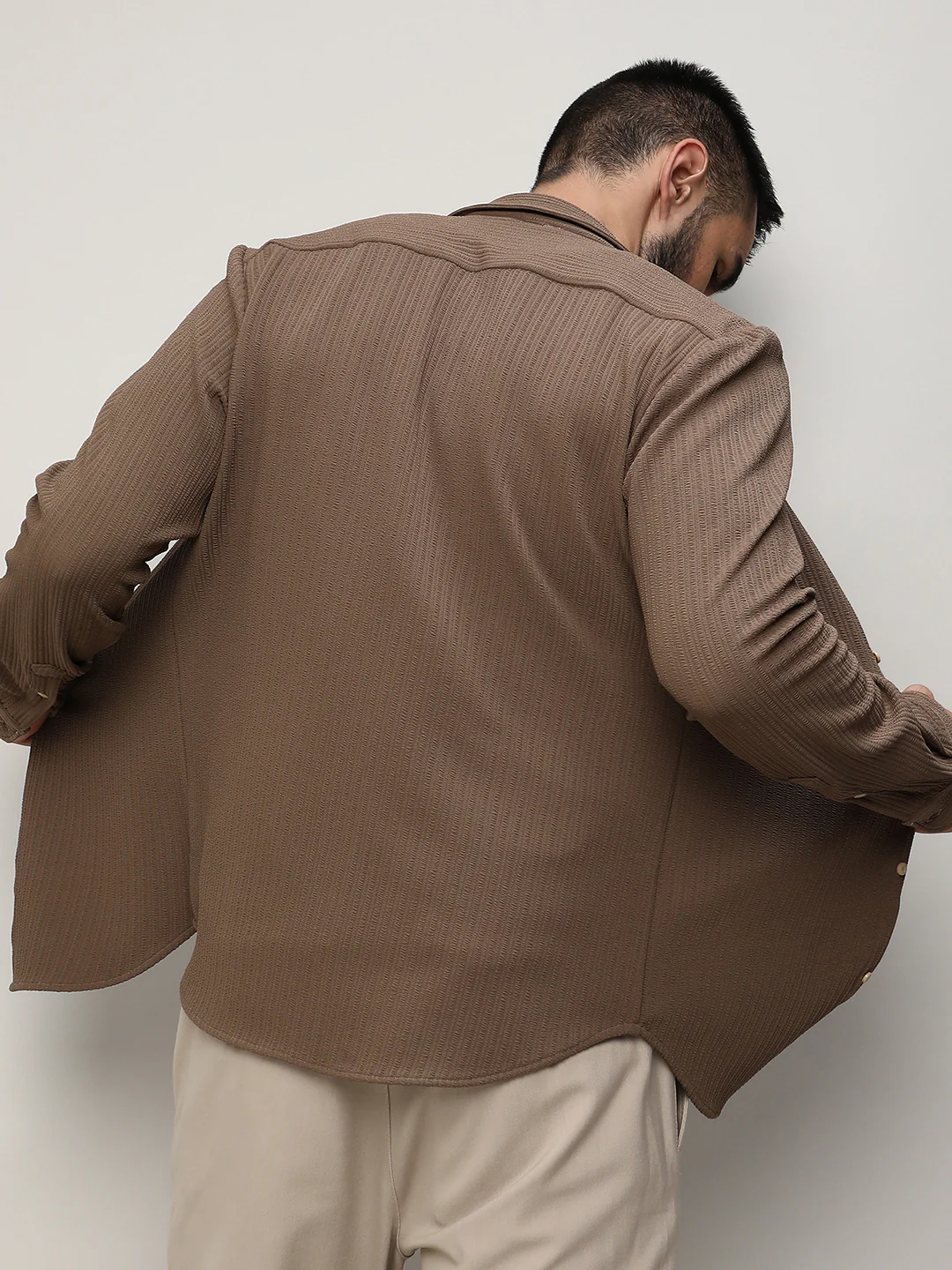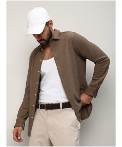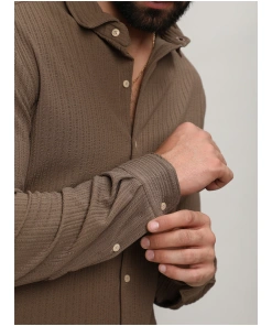 The shirt features a classic button-down front, spread collar, and full sleeves with buttoned cuffs, offering a timeless silhouette with a modern twist. The vertical stripes enhance the shirt’s visual appeal while creating a lengthening effect, adding to its flattering design. The natural crease texture gives it a lived-in, easygoing vibe that’s perfect for those who appreciate understated yet refined fashion. Whether worn tucked in for a smart finish or left untucked for a relaxed look, this shirt adapts seamlessly to your mood and occasion.
