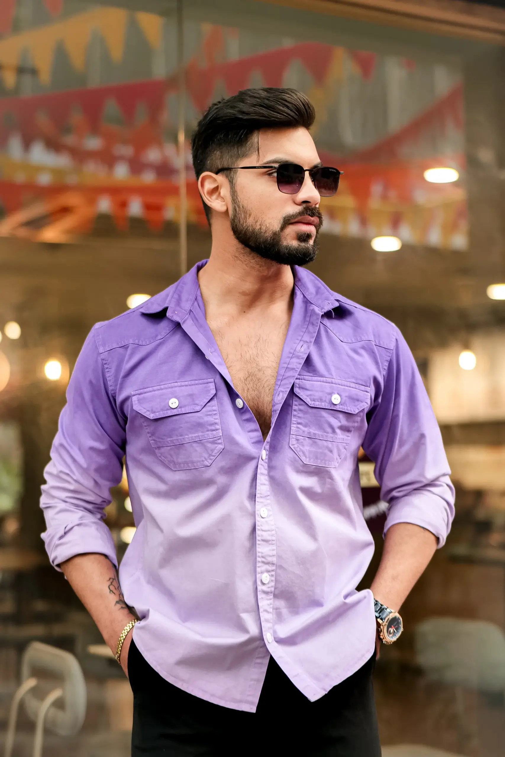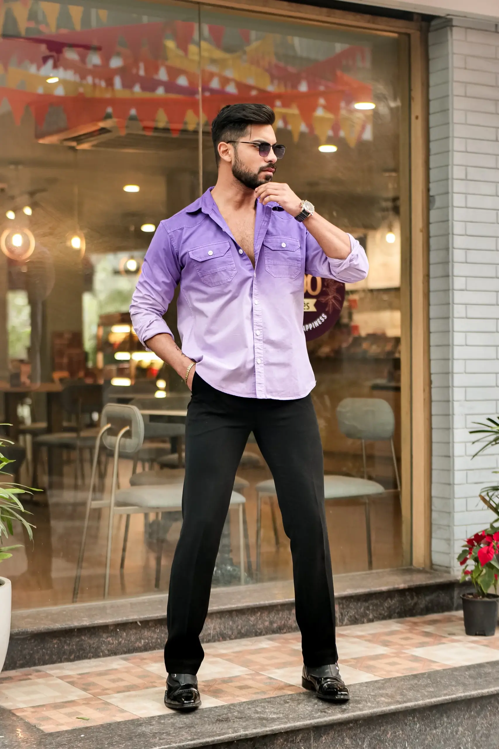 The rich purple hues blend seamlessly, creating a mesmerizing depth of color that catches the eye and exudes elegance. Whether you’re attending a formal event or simply stepping out for a night on the town, this shirt ensures you make a statement with every step.