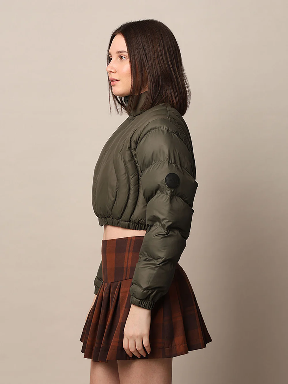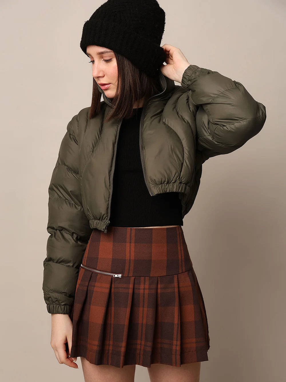 Trendy Olive Hooded Cropped Puffer Jacket, a modern winter essential that combines fashion, functionality, and comfort. Crafted from high-quality insulated fabric, this jacket provides excellent warmth while remaining lightweight, making it ideal for everyday wear, casual outings, or layering over sweaters and hoodies. Its rich olive tone adds a fresh, contemporary touch, making it a versatile piece for your seasonal wardrobe.
