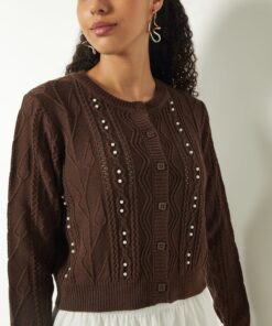 Perfect for dressing up or down, this embellished cardigan pairs beautifully with jeans, trousers, skirts, or dresses, making it suitable for office wear, casual meet-ups, or evening outings. Its neutral tone or soft hues make it easy to coordinate with a variety of colors, while the cozy knit fabric ensures warmth without bulk. Layer it under jackets during colder months or wear it on its own to showcase its stylish detailing and elegant silhouette.