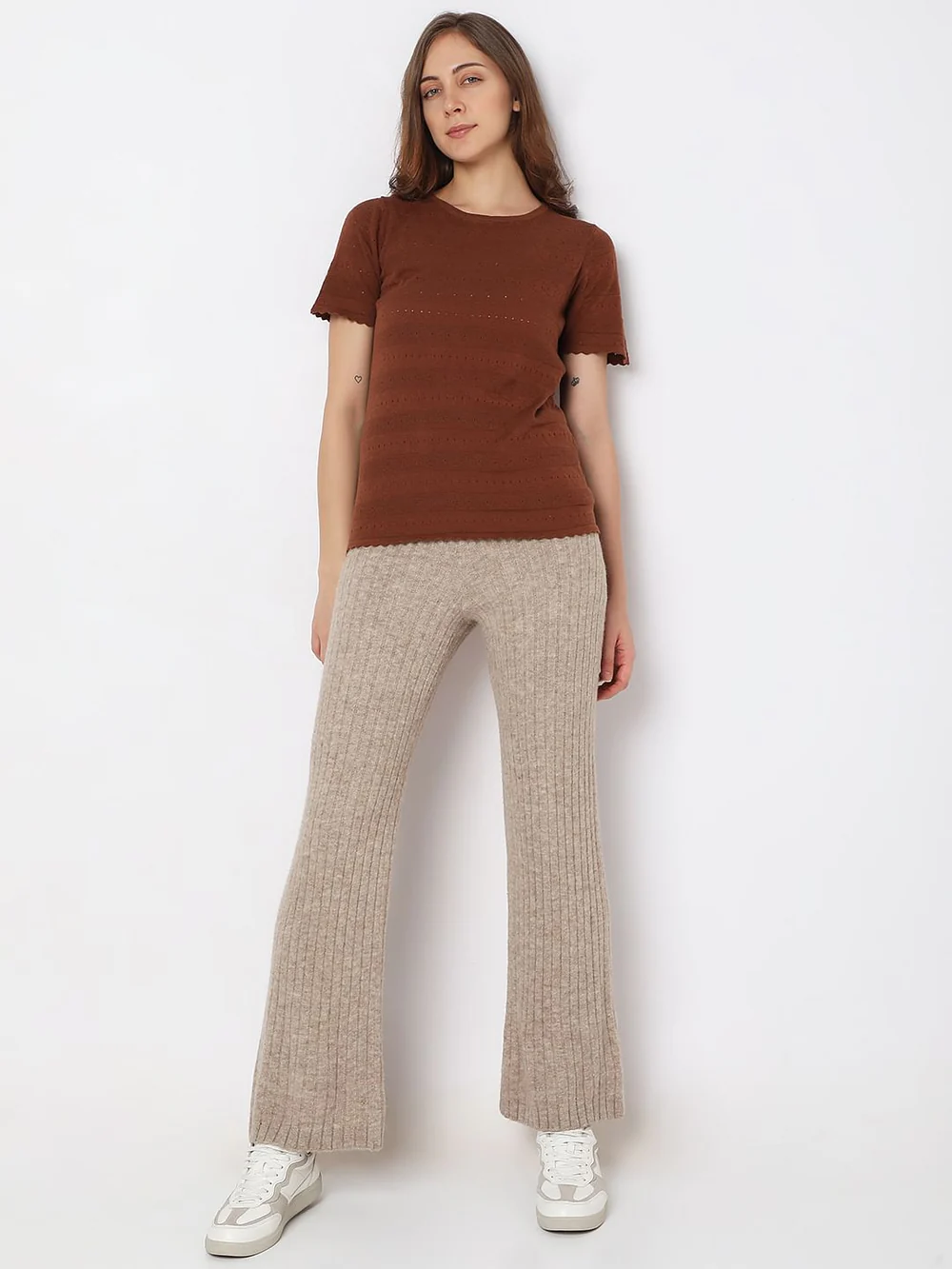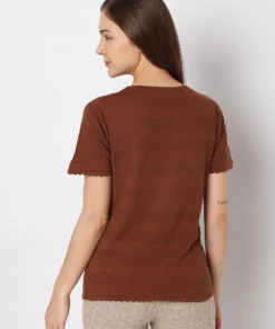 The warm brown shade adds a subtle, earthy tone to your wardrobe, offering an easy-to-style base for a variety of casual outfits. Featuring a classic round neckline, this T-shirt provides a timeless silhouette that flatters different body types, making it suitable for everyday styling.