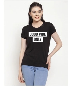 • Style: Women’s black T-shirt with “Good Vibe Only” print for a positive touch.