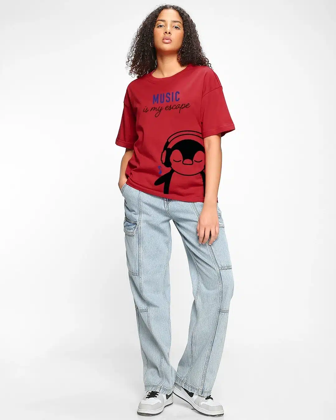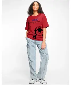 With its eye-catching design and comfortable silhouette, the Women’s Red Music Escape Graphic Printed Oversized T-shirt is sure to become a staple in your wardrobe rotation, perfect for expressing your love for music while staying comfortable and fashionable.